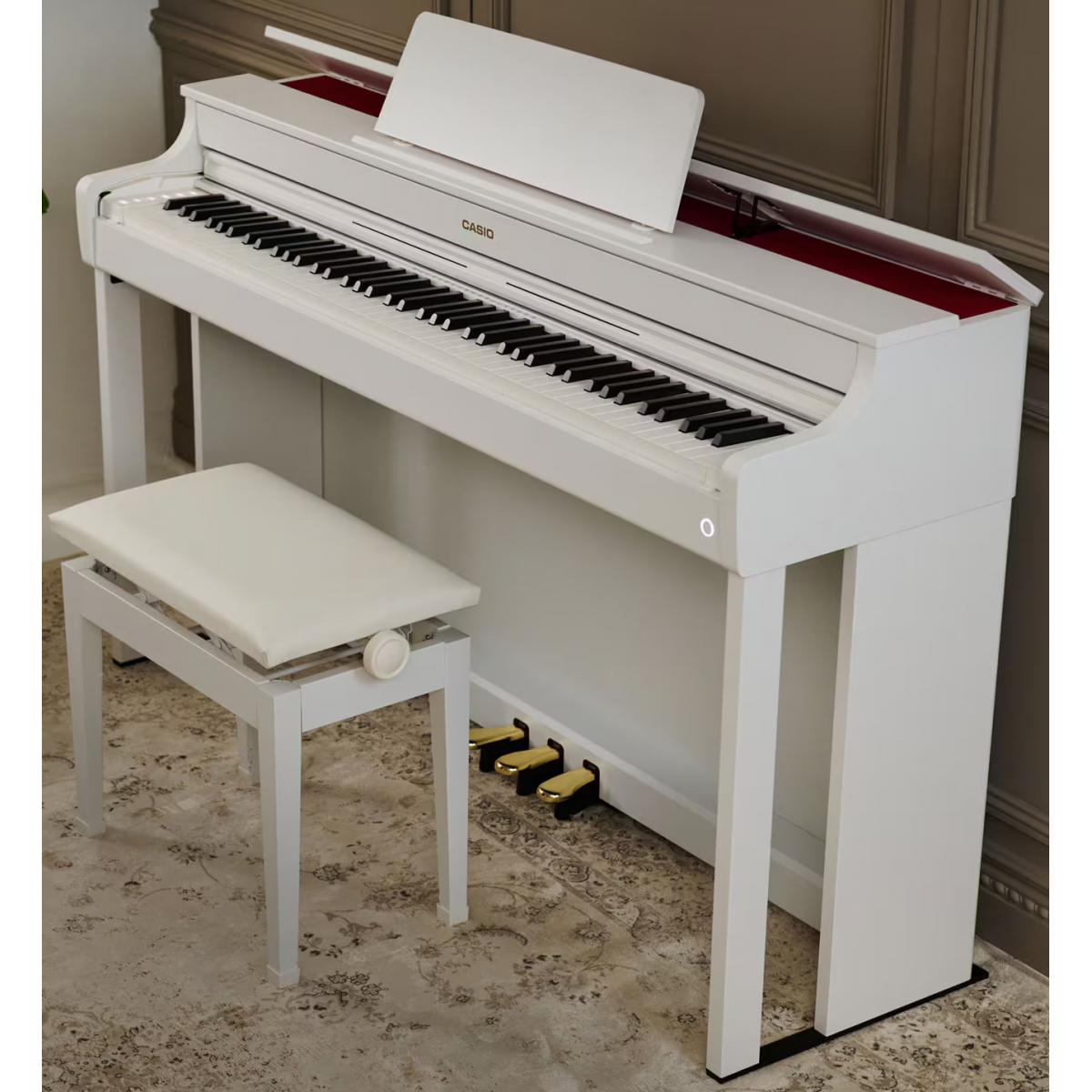 Il Casio AP300 WE è un pianoforte digitale copmeto perfetto per chi desidera approcciarsi al mondo del pianoforte, combinando un design elegante con tecnologie audio avanzate. Grazie alla sua sorgente sonora Multi-Dimensional Morphing AiR, il Casio AP-300 offre un suono ricco e autentico che emula fedelmente la risonanza naturale di un pianoforte a coda.