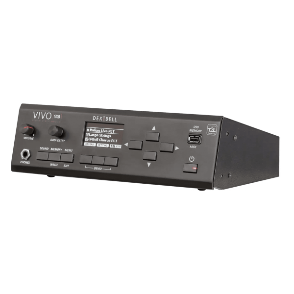 Con il nuovo potentissimo processore, Quad Core Cortex @ 1.8 GHz con 4GB di RAM, le caratteristiche della tecnologia T2L (True to Life) nel Vivo SX8 diventano Advanced. Quadrupla velocità di caricamento suoni, doppia dimensione della memoria, controllo completo di una nuova sezione Organi e 9 potentissimi DSP di effetti, sono alcune delle innovazioni del modulo Vivo SX-8. Nel suo design funzionale sia per uso desktop che rack (alette in dotazione), con un bellissimo case in alluminio nero di soli 2kg, il Vivo SX8 offre i leggendari suoni di pianoforti acustici ed elettrici disponibili in tutta la gamma Vivo, oltre all’accesso e gestione alla straordinaria qualità e vastità della libreria di suoni Dexibell disponibile gratuitamente on-line. La porta USB Memory supporta il protocollo MIDI così che qualsiasi tastiera di qualsiasi produttore può essere collegata ed alimentata direttamente via USB senza la presenza di un computer, mentre la porta USB Computer veicola simultaneamente sia i dati MIDI che il segnale audio in digitale a 24bit/48kHz. Ovviamente il Vivo SX8 non ha bisogno di scheda audio per essere collegato direttamente al computer e registrare/suonare dati MIDI e Audio.