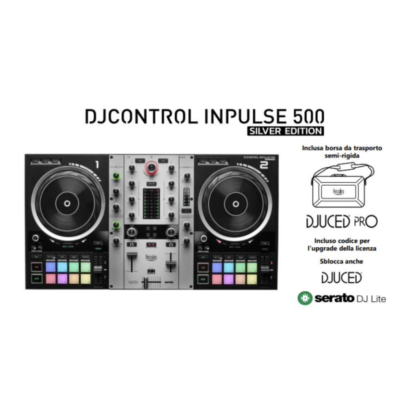 Hercules DJControl Inpulse 500 è il nuovo controller DJ che soddisfa la tua ambizione. Creato per Serato DJ Lite e DJUCED per aiutarti a iniziare a mixare come un DJ, migliorare le tue abilità e esibirti davanti ad un pubblico, DJControl Inpulse 500 ha un design professionale con una robusta placca metallica protettiva ed un sacco di funzioni eccezionali: quattro piedini estendibili/retrattili per sollevare il tuo mixaggio, un mixer hardware per gli ingressi audio, un'area dedicata Filter/FX con fantastici effetti, due ampie manopole jog sensibili al tocco per lo scratching, 16 pad RGB in gomma retroilluminati, utili guide luminose per mixare in totale fiducia...e molto altro ancora. Puoi persino mixare utilizzando i milioni di brani dei servizi di musica in streaming, tra cui TIDAL e SoundCloud GO+ in Serato DJ Lite, e Beatport LINK, Beatsource LINK e Qobuz in DJUCED.