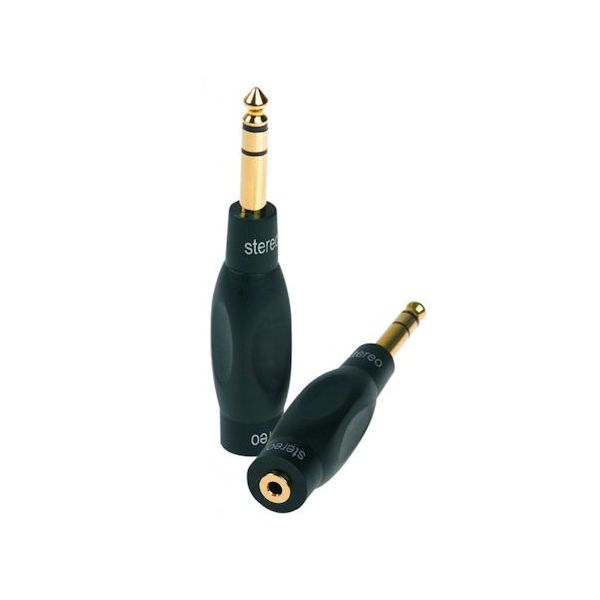 Adattatore con corpo interamente in ABS. Spina 6,3 mm stereo > presa 3,5 mm stereo
