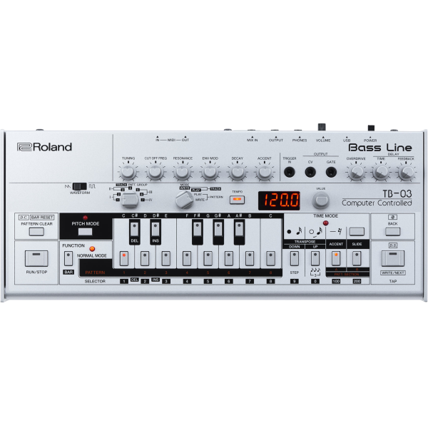 La TB-03 alimentata a batterie è una diretta discendente della famosa TB-303 Bass Line. Il layout e il controllo sono identici, e di conseguenza funziona esattamente come l'originale! E suona anche come l'originale, grazie all'avanzata tecnologia ACB di Roland che ricrea quei groove liquidi ed ipnotici della magica scatoletta argentata. Ma la nuova TB-03 si spinge ben oltre con molti miglioramenti rispetto al modello originale. Il display a LED a quattro cifre rende la programmazione più semplice ed accurata, mentre gli effetti overdrive e delay permettono di scatenare un muro di suono tribale e ipnotico che manderà la folla in trance. Tornando in studio, la TB-03 può inviare informazioni di controllo via MIDI, o dalla sua porta USB che funziona anche da interfaccia audio a 24-bit/96 kHz.