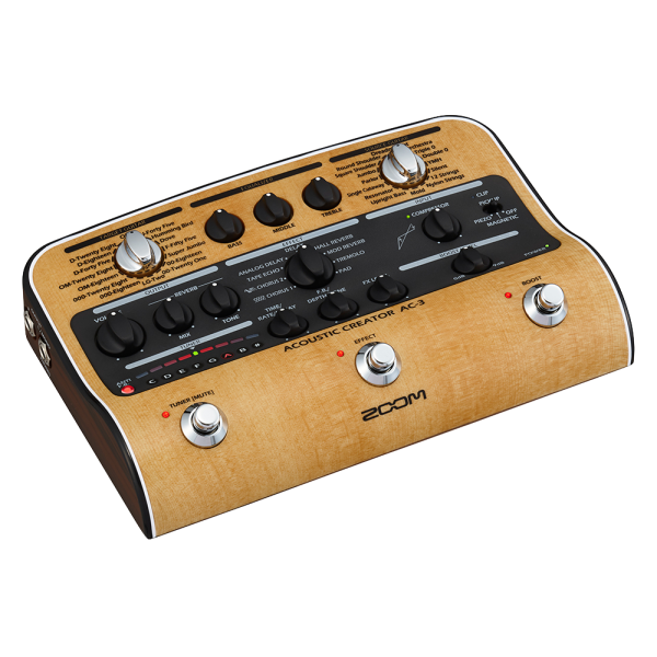 Come il suo fratello minore, l'AC-3 Acoustic Creator è una direct box avanzata con funzioni di DI essenziali che ti aiutano a ottenere un grande suono, non importa dove si suoni. L'AC-3 è dotato di un generatore di effetti, di uscite stereo e di un compressore. Con queste funzionalità, più lo stesso preamplificatore di alta qualità ed un equalizzatore a 3 bande, l'AC-3 è un toolkit acustico all-in-one perfetto per le performance dal vivo e in studio. Il preamplificatore di alta qualità da una spinta al tuo segnale e aiuta a ripristinare il tuo vero suono acustico. Inoltre, il suo EQ a 3 bande consente di eseguire rapidamente le regolazioni perfette per migliorare il suono. Per aggiungere profondità e colore al suono, l' AC 3 offre anche i migliori effetti che Zoom abbia mai progettato per l'acustica. Scegli tra 9 effetti differenti, quali delay, chorus e riverbero, ognuno dei quali ha parametri regolabili per ottimizzare il suono. Con 16 preset di chitarra d'origine, l'AC-3 recupera le caratteristiche sonore di molti tipi di chitarra e forme del body. Puoi scegliere tra dreadnought, contrabbasso, corde in nylon, 12 corde ed altro ancora. Basta selezionare la tua chitarra preferita, quindi selezionare pickup piezo o magnetico. A questo punto l'AC-3 è pronto a riprodurre e amplificare con precisione assoluta il suono della chitarra. L'AC-3 viene fornita con 15 preset aggiuntivi di chitarre target, che è possibile utilizzare per abbinare con maggiore precisione il suono della chitarra. Ad esempio, quando si utilizza un dreadnought Martin D-18, è possibile scegliere il preset della chitarra di origine Dreadnought ed il preset della chitarra D-Eighteen come chitarra target per farlo corrispondere meglio al suono unico del tuo strumento. Oppure, se stai suonando una chitarra a spalla quadrata, scegli il preset di origine Square Shoulder, quindi utilizza il preset di destinazione Humming Bird per ricreare ancora più accuratamente il tuo suono.
